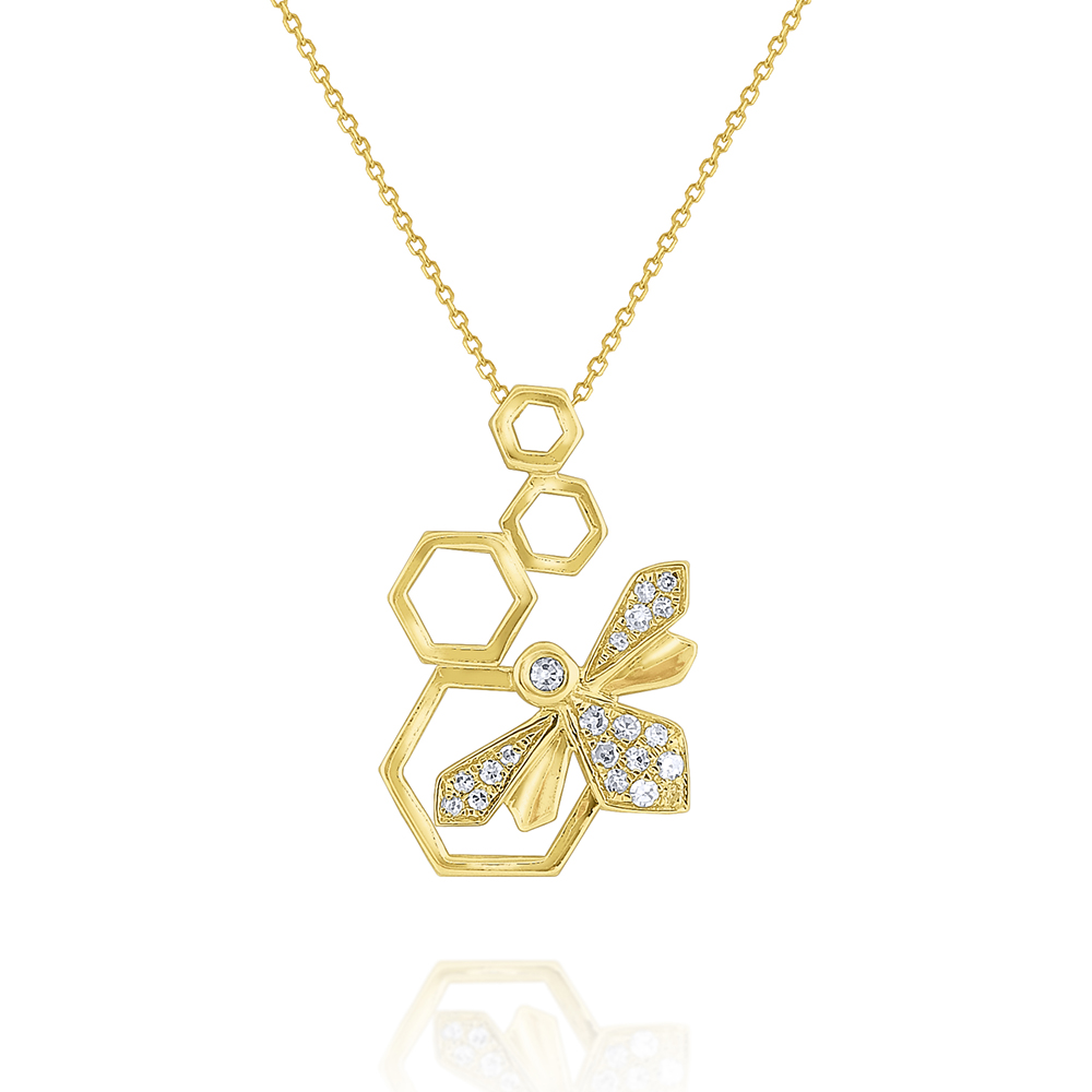 Sweet as honey! A bee touched with diamonds on a golden honeycomb swings freely on an adjustable chain.