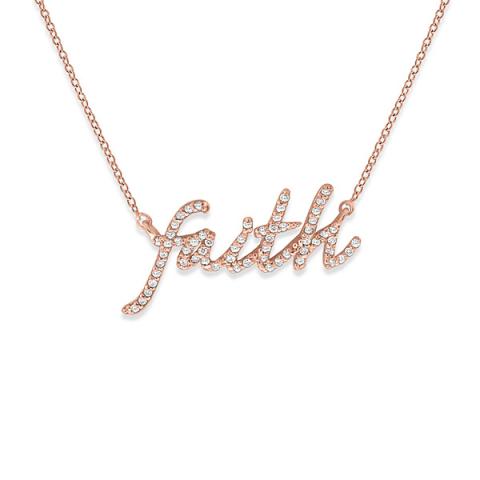 Faith is important and having faith can give our lives deeper meaning and help us to overcome obstacles and emerge from dark times and struggles in our lives. You can express what your faith means to you with this beautiful diamond "faith" necklace. It contains 59 glimmering .26 ct tw diamonds and is shown here in rose gold.