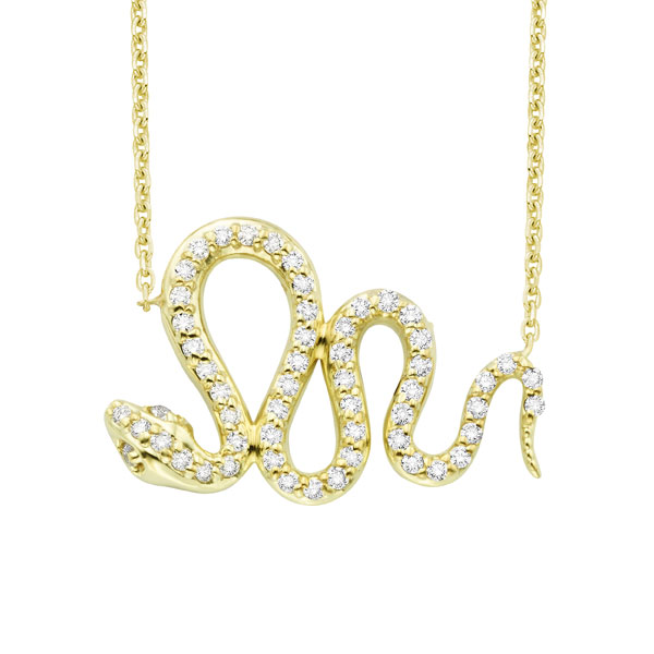 Even a woman who isn't fond of snakes will have nothing to fear from this "diamondback". Elegantly set with 55 diamonds weighing 40cts tw, this lovely 14K yellow gold necklace is sure to make her look at snakes differently. Sleek and elegant, it's a necklace that's sure to warm her heart and make her smile.