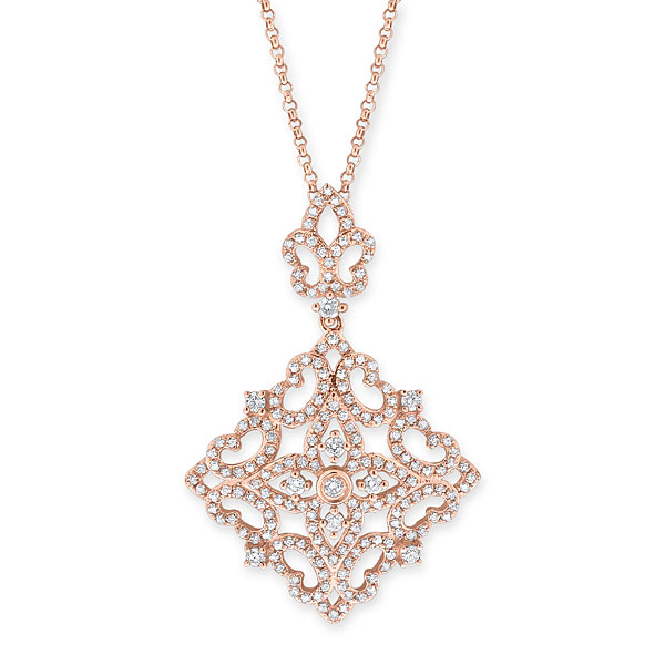 If you love jewelry with an antique style, then you are going to want to add this to your collection. Set in 14K Rose Gold, this beautiful necklace has 193 diamonds weighing .74cts tw. With an intricate and amazing design reminiscent of yesteryear, this beautiful necklace is a great pick for any antique lover.