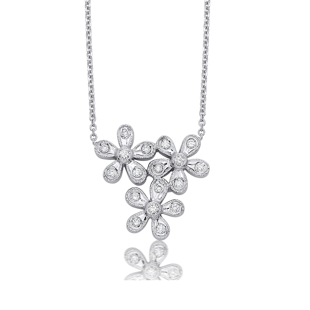 Three darling daisy flowers shine bright in 14k gold and diamonds on an 18" chain.