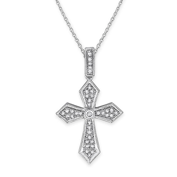 If you are searching for a piece of cross jewelry that gives you a different look, then you might enjoy the look of this lovely diamond cross necklace. Set with 37 breathtaking diamonds weighing .09cts tw, this 14K white gold necklace is the perfect choice for yourself or for someone on your gift list.