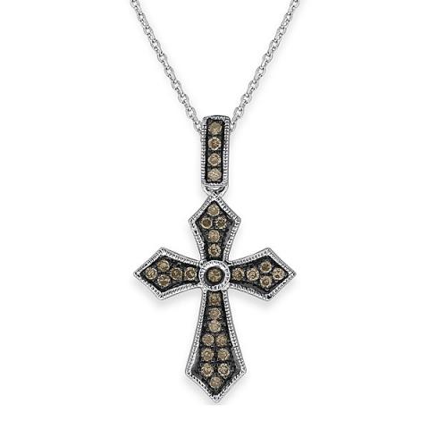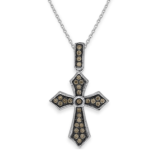 Nothing beats the elegance of champagne diamonds and these are beautifully displayed in this elegant champagne diamond cross necklace. Set in 14K white gold and black rhodium, 30 gorgeous champagne diamonds sparkle weighing .19cts tw. If you are looking for a special gift for someone else or for yourself, this elegant and unique piece is a good choice.