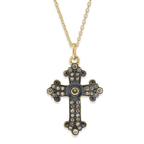 Champagne Diamond Cross Necklace in 14k Yellow Gold and Black Rhodium with 37 Diamonds weighing .21ct tw.