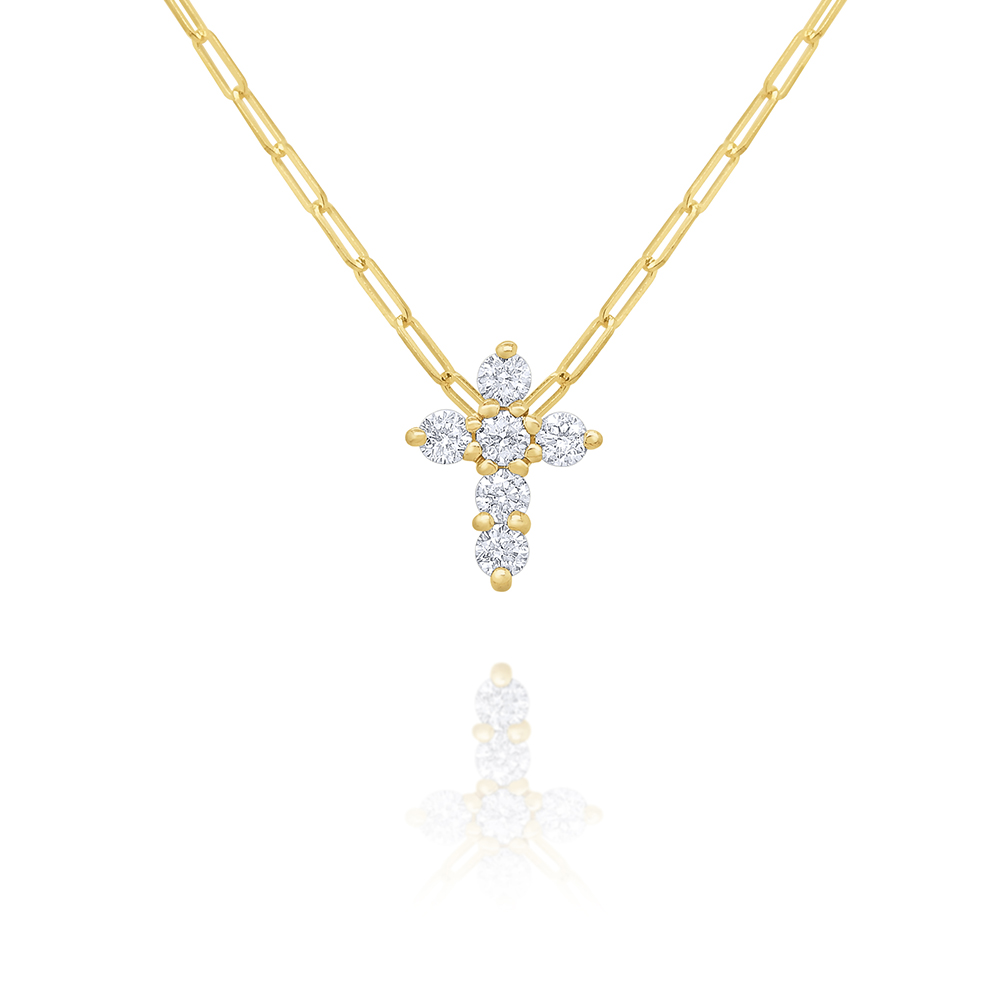 Six sparkling diamonds make up this gorgeous cross on a golden paperclip chain.