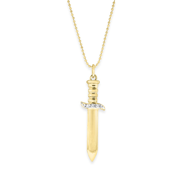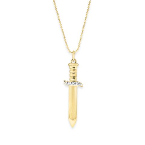 Take on the world with a sword pendant! The intricate detail in this piece is found in a swath of 3 diamonds, weighing .03ct tw., across the front that gives it an unexpected touch, and the classic setting of 14K yellow gold shines brightly in the background. Fun, fearless females will look no further when adding different pieces to their personal jewelry collection.