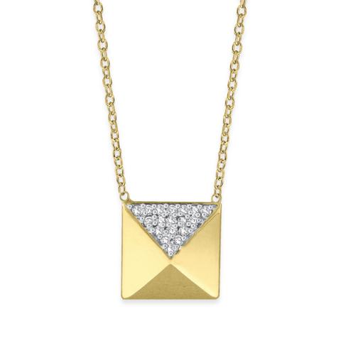 Envelope her in your love with this gorgeous yellow gold and diamond pyramid pendant. They say a gesture is worth 1000 words, and this one is no exception. Set in 14K yellow gold, this classy yet edgy pendant is swathed with 18 diamonds on one glistening side weighing .10ct tw.