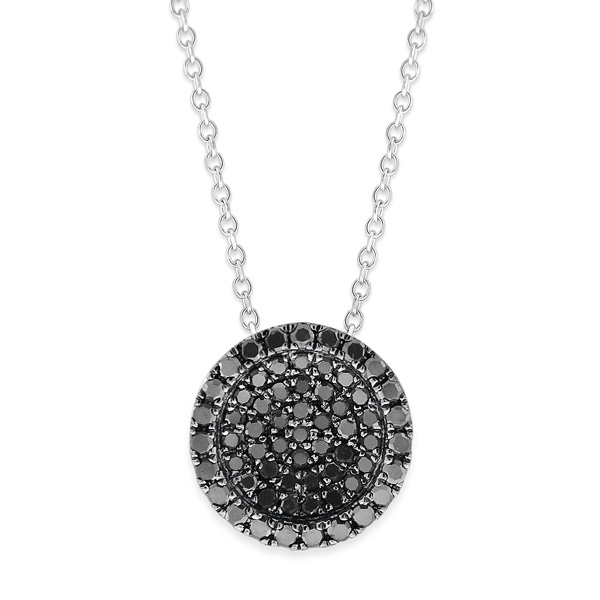 A dramatic piece that gets noticed, the circle drop disc necklace is inlaid with 62 black diamonds, weighing .30ct tw. and set in 14k white gold with black rhodium. It is always a glamorous option for the woman who likes to mix up her jewelry choices. The round concaved shape adds a softness that makes it suitable to wear anytime. It is the kind of piece that can let you be a bit more dramatic each day. Why should good jewels just be for night?