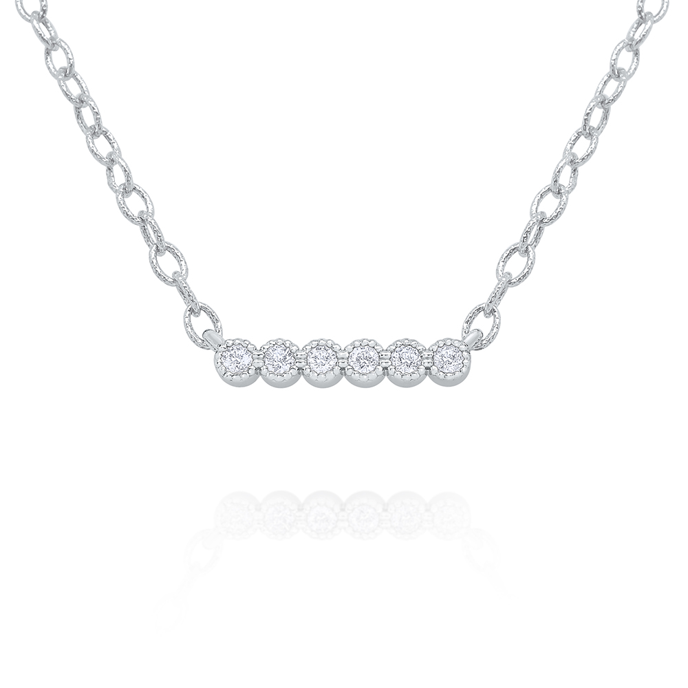 Six sparkling diamonds set in bezels with a milgrain finish make up this simple, everyday bar necklace.