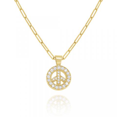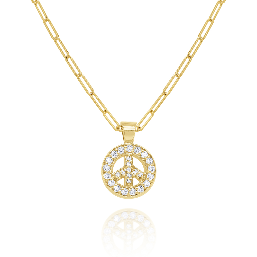 A charming peace sign necklace with 26 sparkling diamonds slides along a golden paperclip chain.