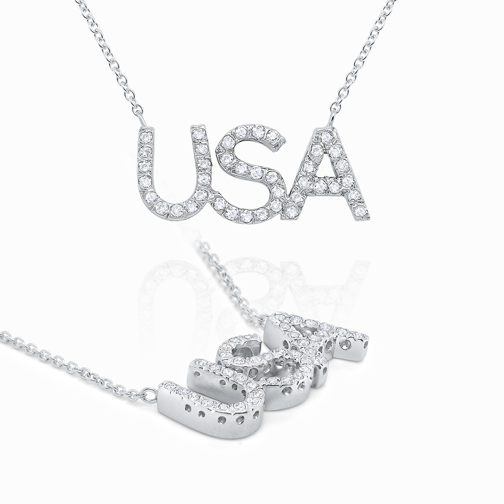 Proud to be an American! Show off your red, white and blue pride with our diamond USA necklace. Layer it up with your state in diamonds for a sparkling patriotic look.