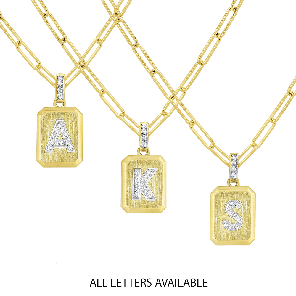 A diamond dog tag initial hangs on a bold 18" paperclip chain....right on trend. Stack your other charms on for a fun personalized look.