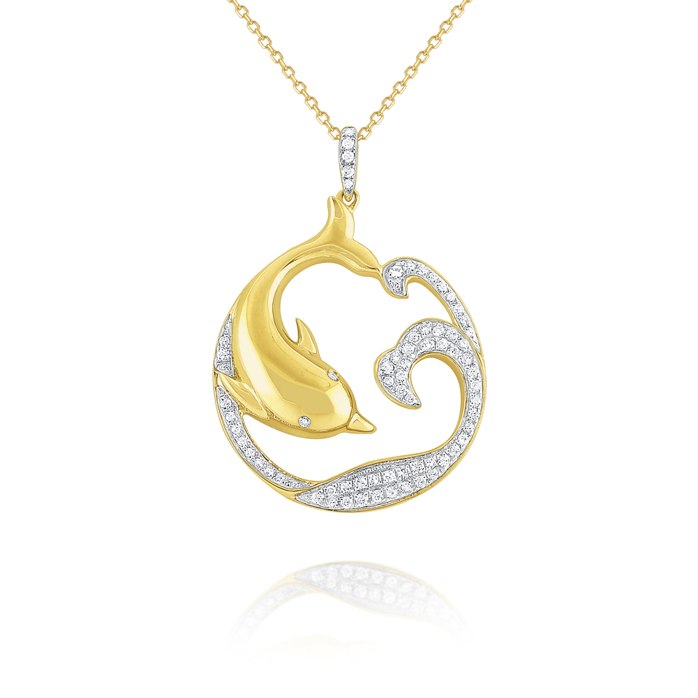 A golden dolphin playfully swims among sparkling diamond waves....the perfect necklace for the beach lover.