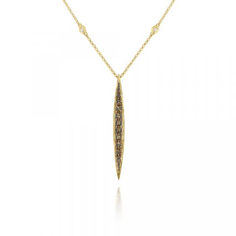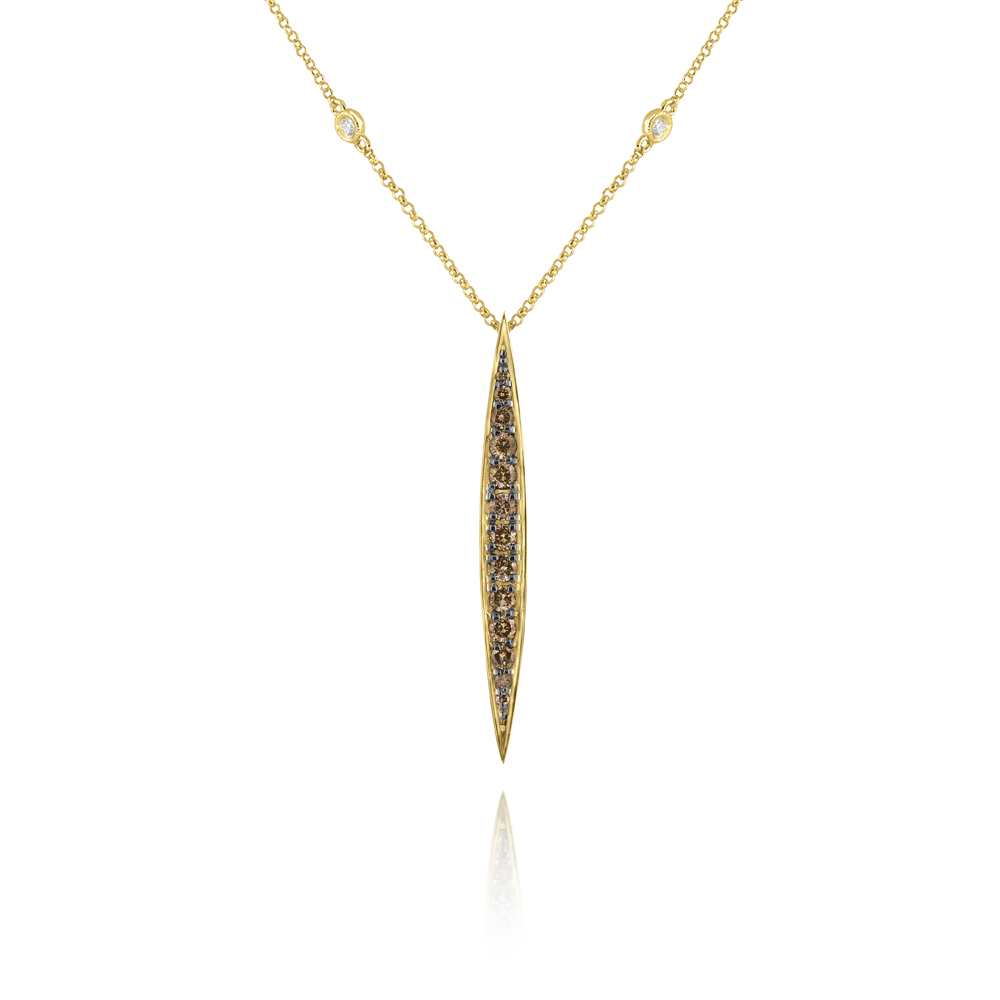 A pod shaped pendant cradles 21 champagne diamonds as it flawlessly hangs on a 14K yellow gold chain.