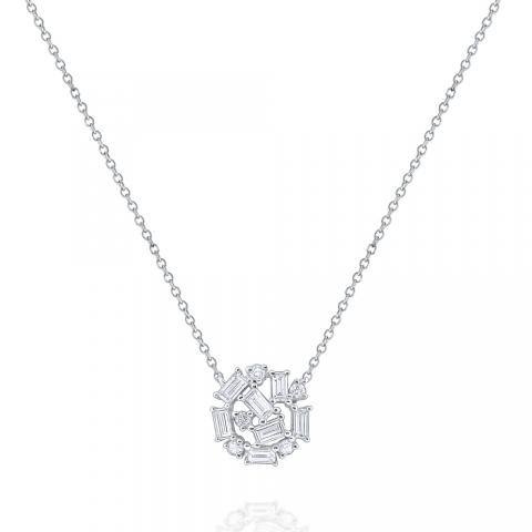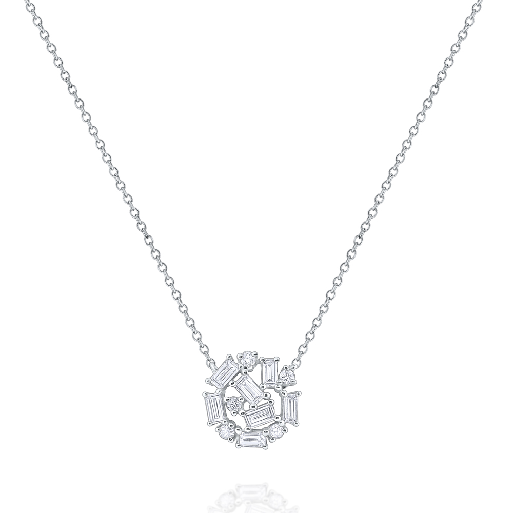 A scatter arrangement of baguette shapes form a circular cluster of diamonds.