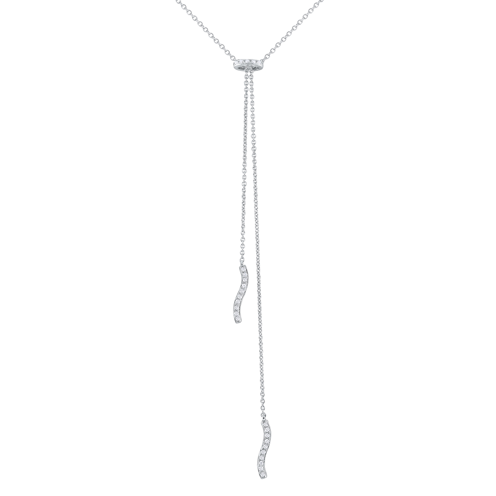 Two uneven chains nestle securely within a 14K gold open oval where they cascade beautifully and come to meet two diamond curved mini bars.