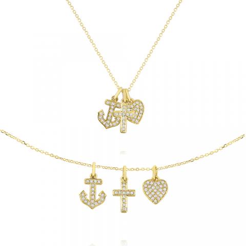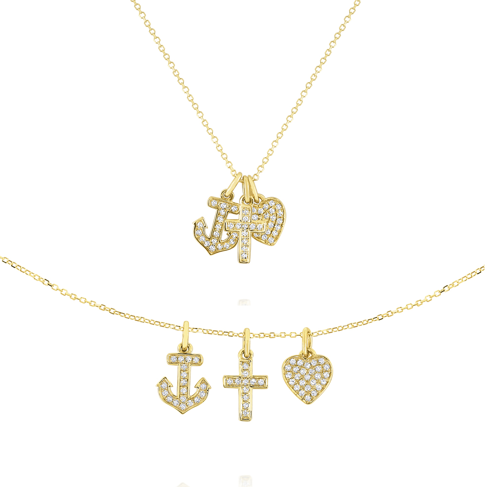 Three sparkling, feminine charms representing faith, hope and charity come together to compliment a 14K gold chain.
