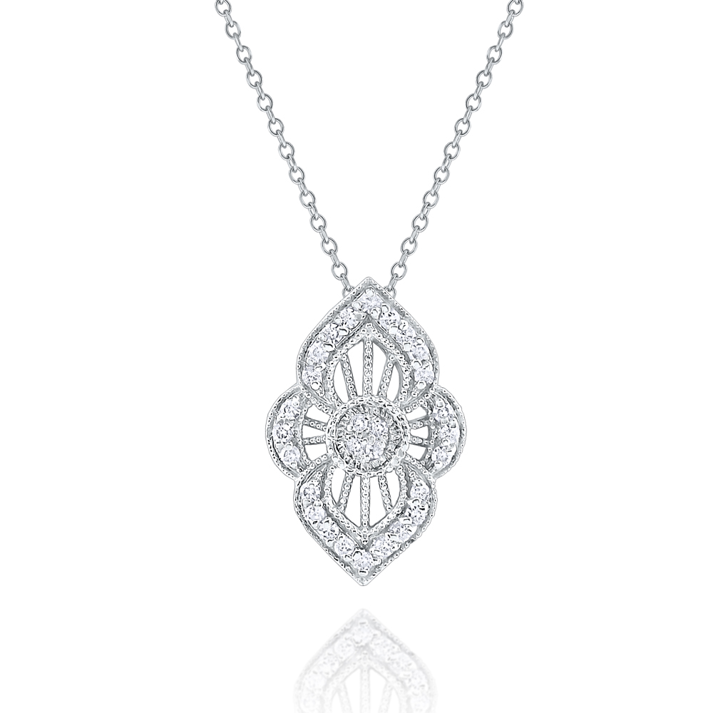 This Victorian style design radiates beautiful diamonds atop an antique inspired pendant giving a sense of elegance to your neckline.
