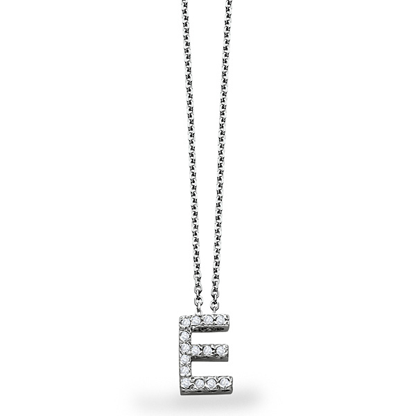 E is for excellence and elegance and whether your name is Elizabeth, Emily, Emma, Erin or Erica you will love this gorgeous diamond block initial "E" necklace. It is perfect for expressing your unique identity and giving a personal touch to your look. It is decorated with 15 shimmering .11 ct tw diamonds and it is shown here in 14K white gold.