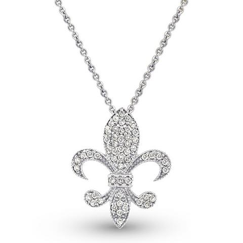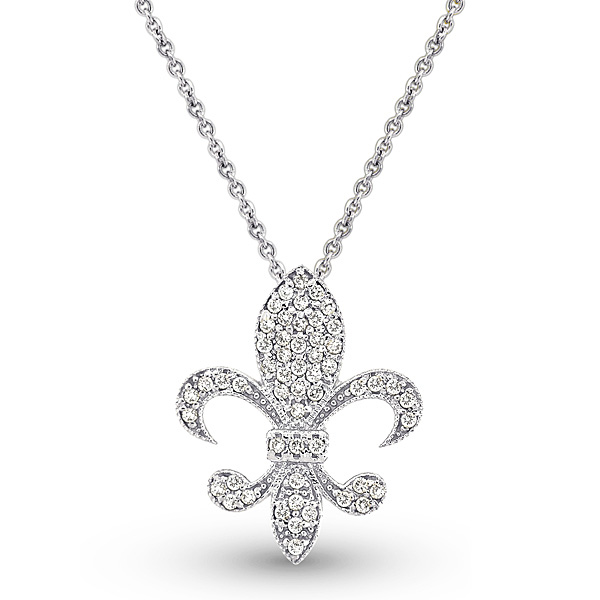 The Fleur-de-Lis, long associated with the French crown and treasured symbol of Louisiana shines in 14k gold and diamonds on an 18" chain.