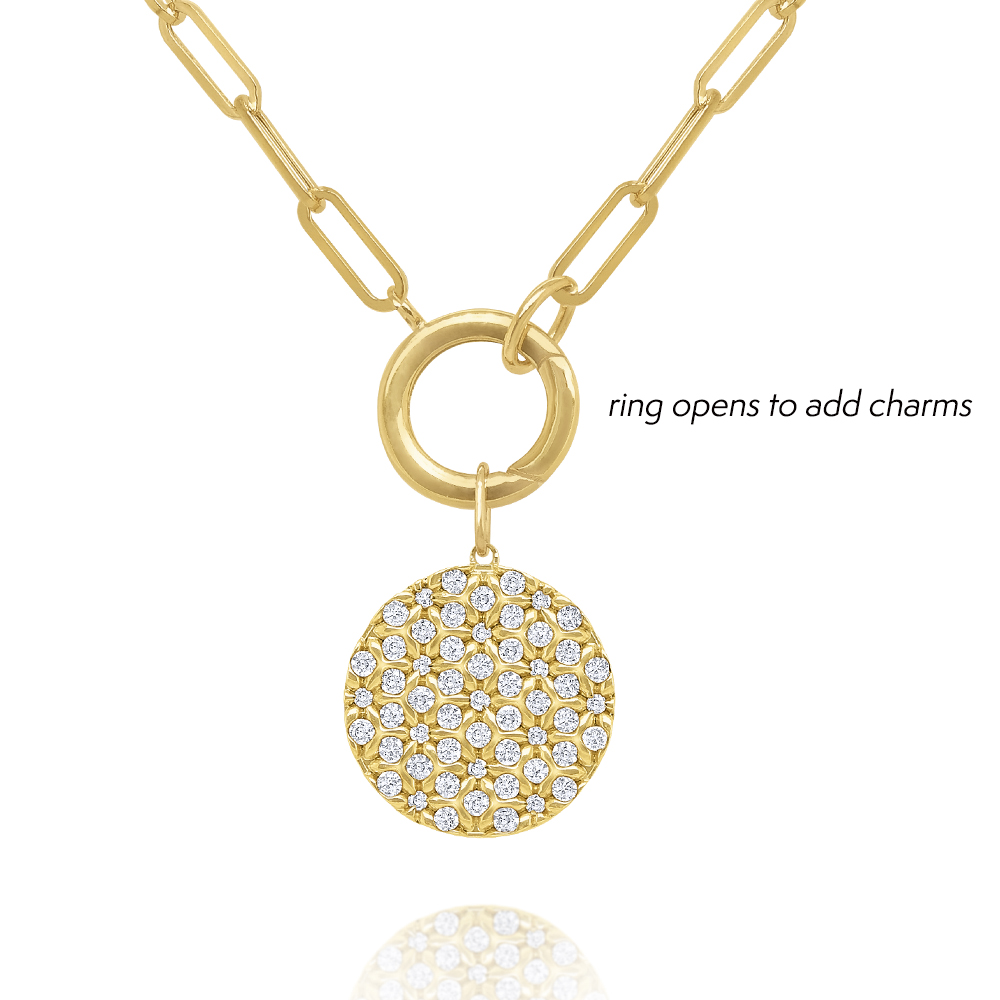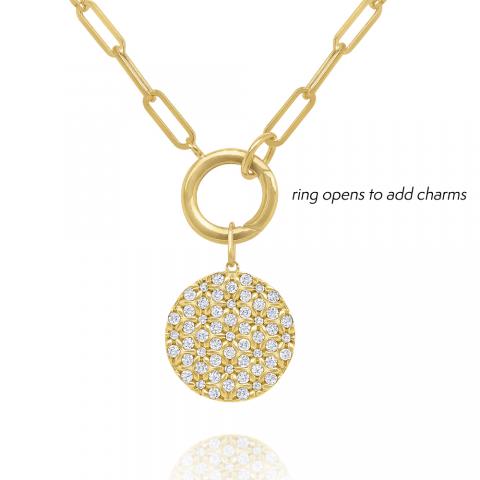 The classic pave diamond disc hangs off a golden paperclip chain and charm holder. Add other charms to personalize the look.