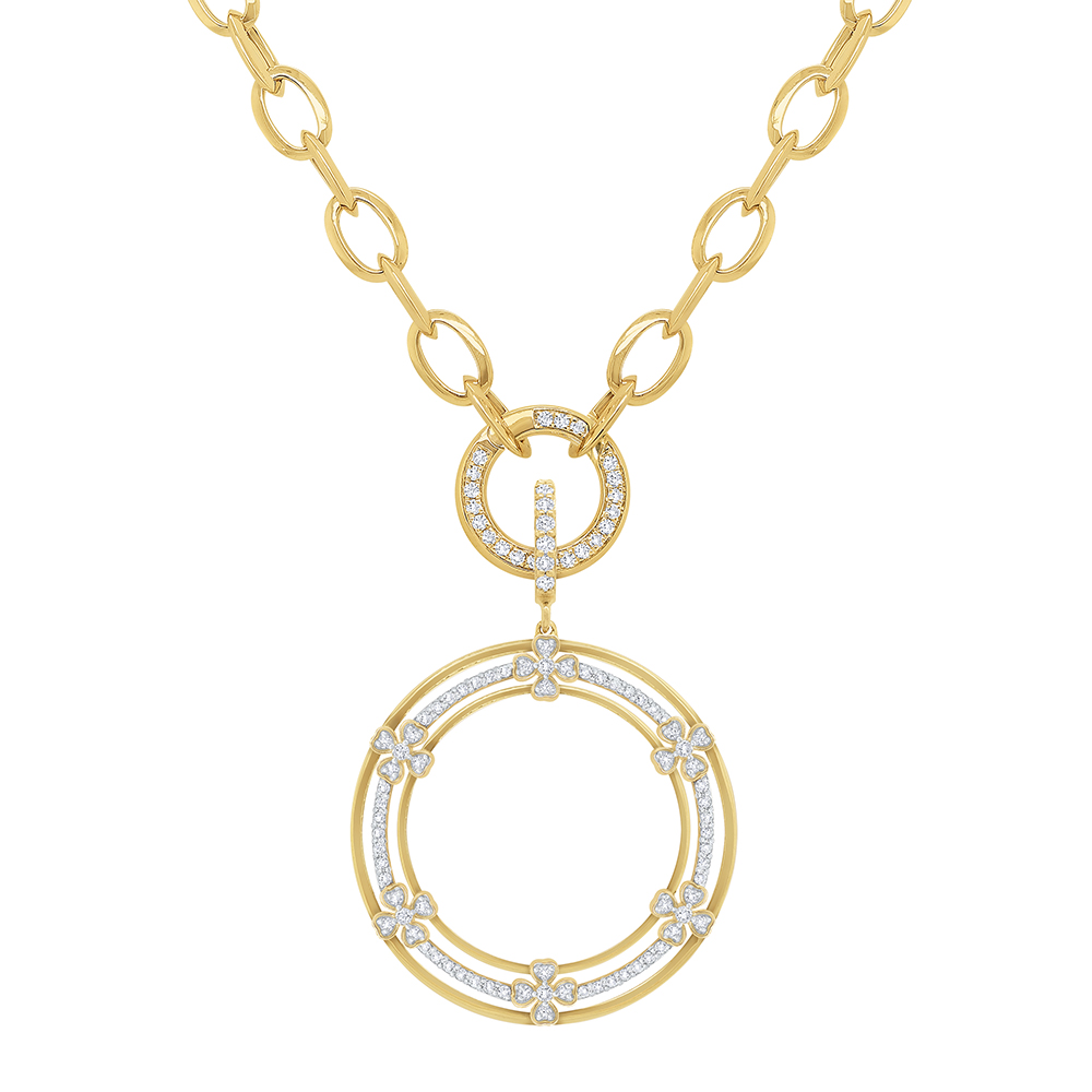 Small diamond four leaf clovers on an openwork gold circle create this stunning necklace. Pendant is removeable from charm holder.
