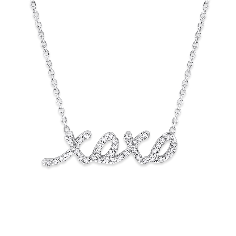 Show her you love her with this adorable diamond double "xo" necklace set in 14k white gold with 40 mesmerizing diamonds weighing .20ct tw (n2862). She will not be able to wait to put it on and feel your caress all day long. Just the lingering memory of the feeling of your hands as you clasped this necklace to the nape of her neck with have her daydreaming for hours.