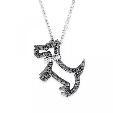 Black And White Diamond Scottie Dog Necklace in 14K White Gold with 44 Diamonds Weighing .24ct tw