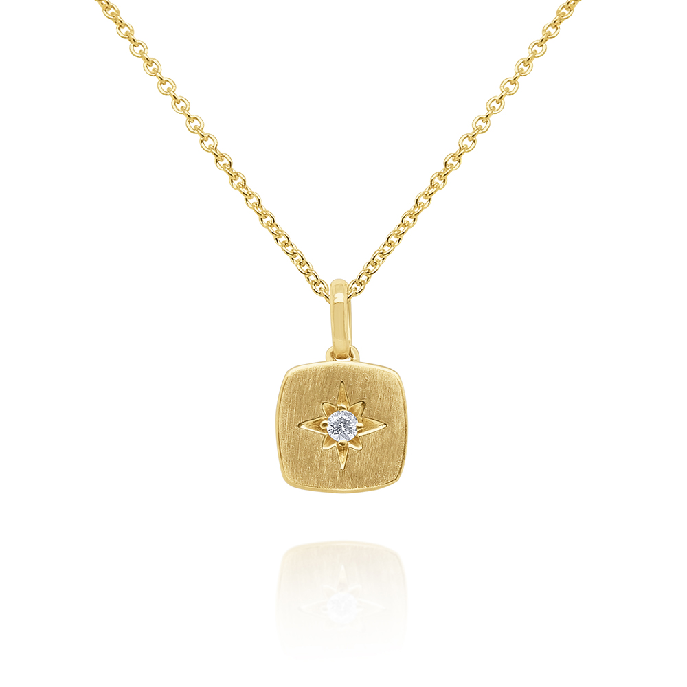 A single diamond starburst shines in 14k gold with a soft brushed finish on a 16" chain.