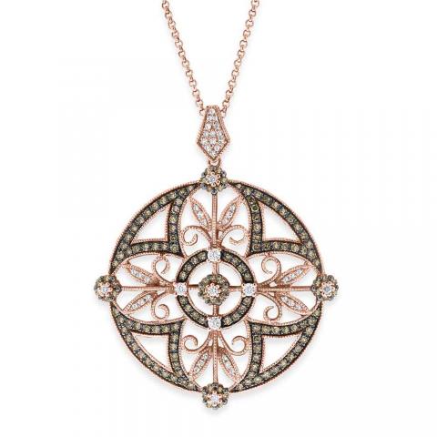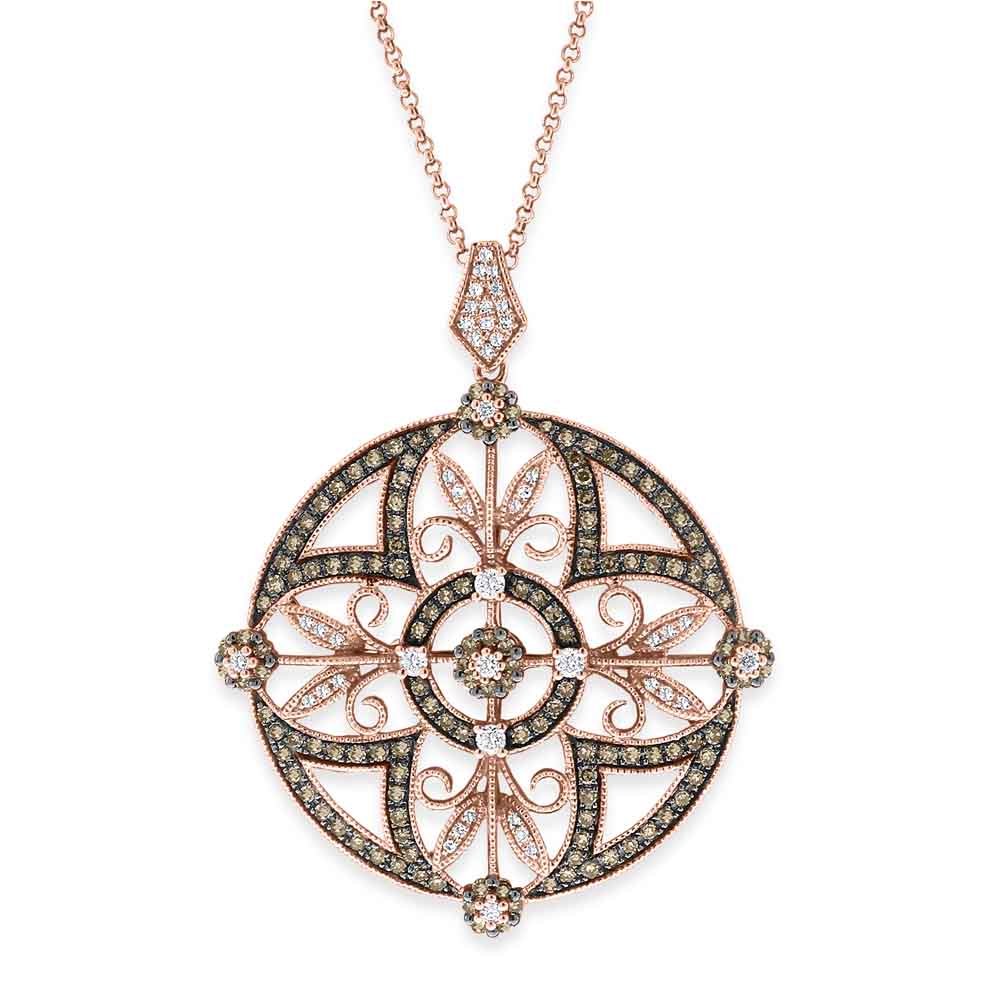 This intricate, delicate, lacy champagne and white diamond medallion necklace will add a vintage feel to your apparel. Set in in 14K rose gold with 187 sparkling diamonds weighing 1.03ct tw, this decorative necklace is quite attractive. Don this to your next affair and everyone will be complimenting you on your classic taste and unique style.