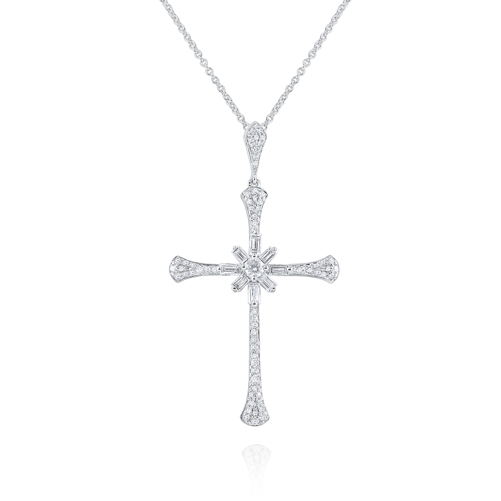 This sparkling cross necklace hangs on a white gold chain embellished by 74 round and baguette diamonds.