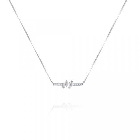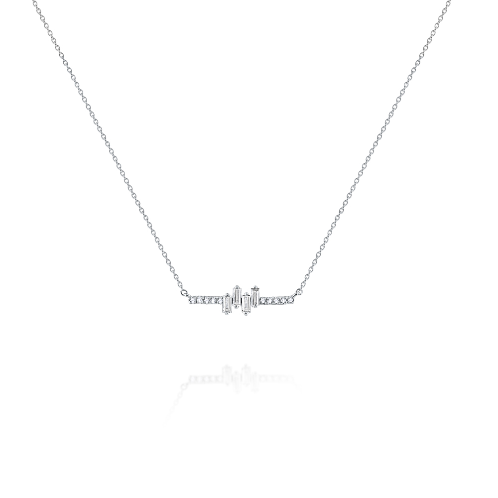 A horizontal bar design is accented with baguette and round diamonds for a contemporary feel to a classic design.