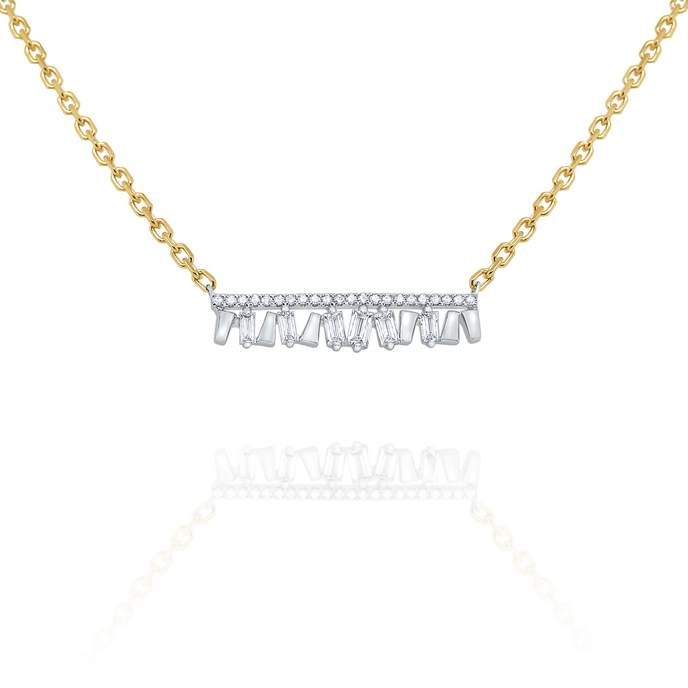 Baguettes dance below a diamond bar for a modern, contemporary look.