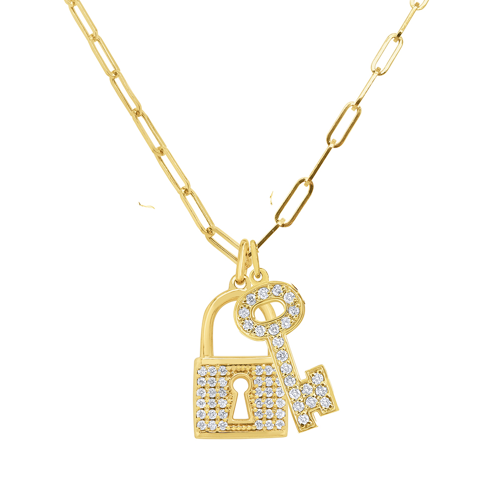 Diamond lock and key charms hang playfully on a golden 18" paperclip chain.