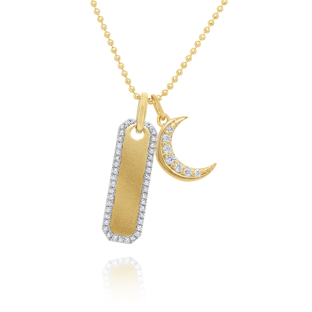 Diamonds moon and tag charms hang on an 18" chain. The tag can be engraved for a more personalized look.