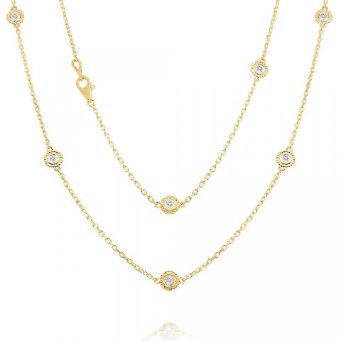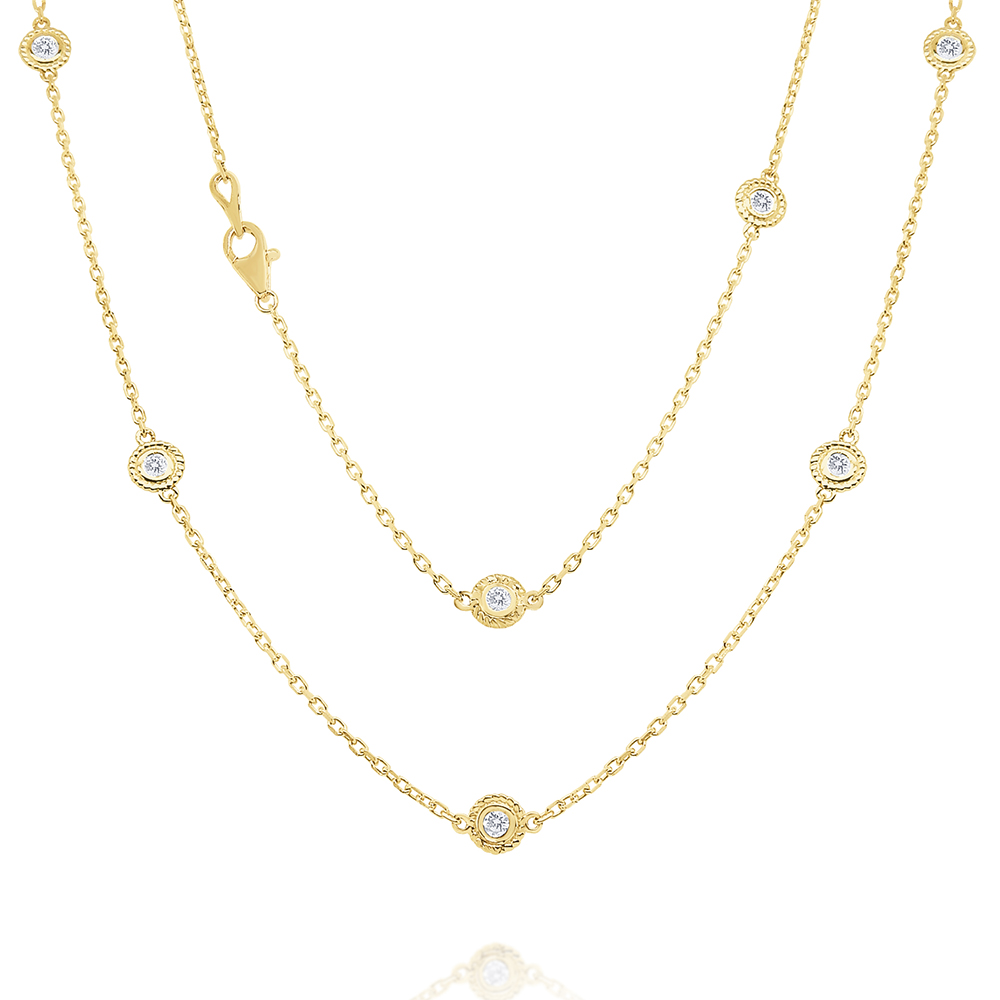 The classic diamonds by the yard necklace takes a modern twist. Diamonds are set in wide bezels with textured detail. The 24' length is perfect for wearing ling or doubling up for a layered look.