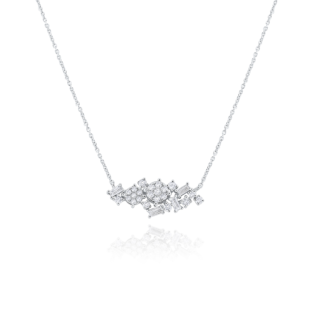 A mixture of round and baguette diamonds hang horizontally on a classic white gold chain.