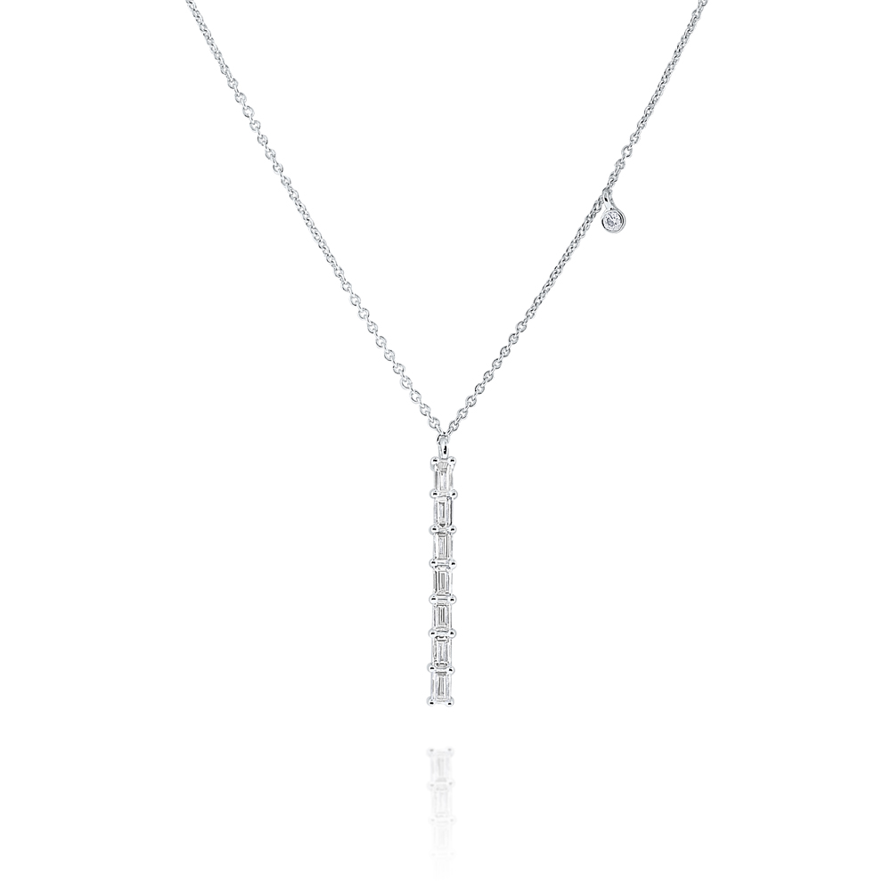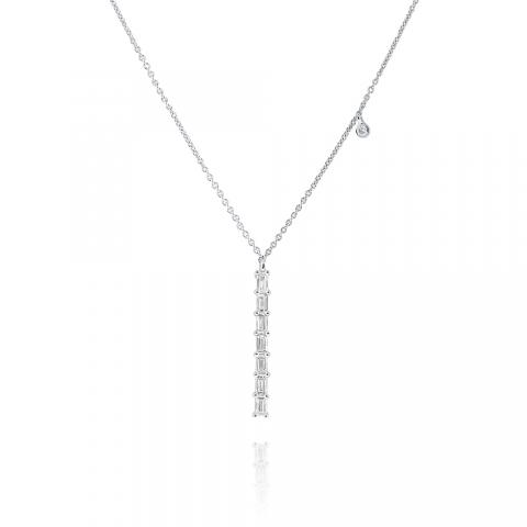 A slender diamond bar of baguette diamonds is joined by a single bezel set diamond dangling on a simple chain.