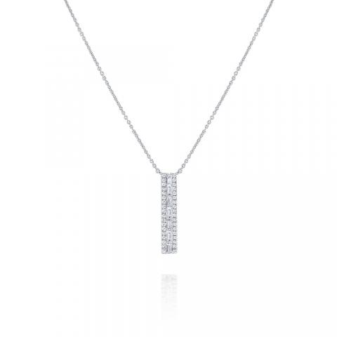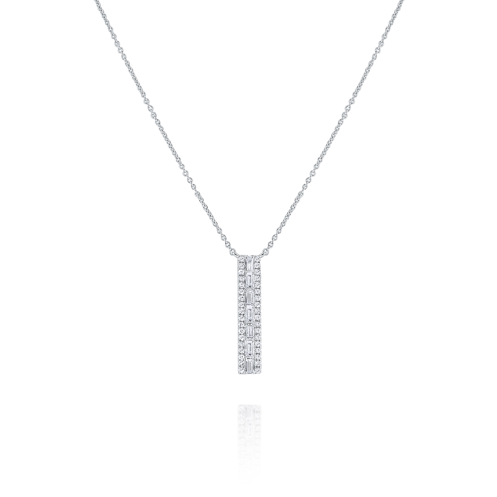 Pave diamonds border a line of baguette shaped diamonds attached to a classic white gold chain. This simplistic geometric design is a must have!