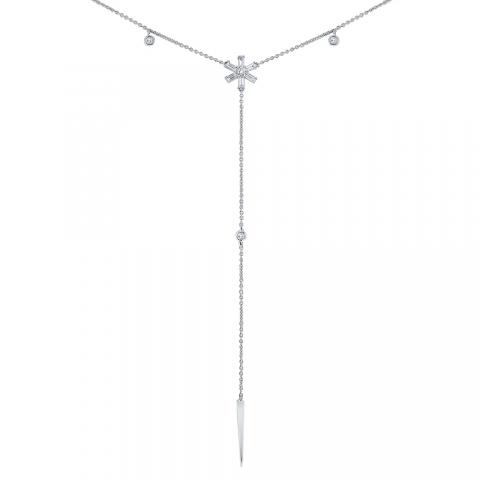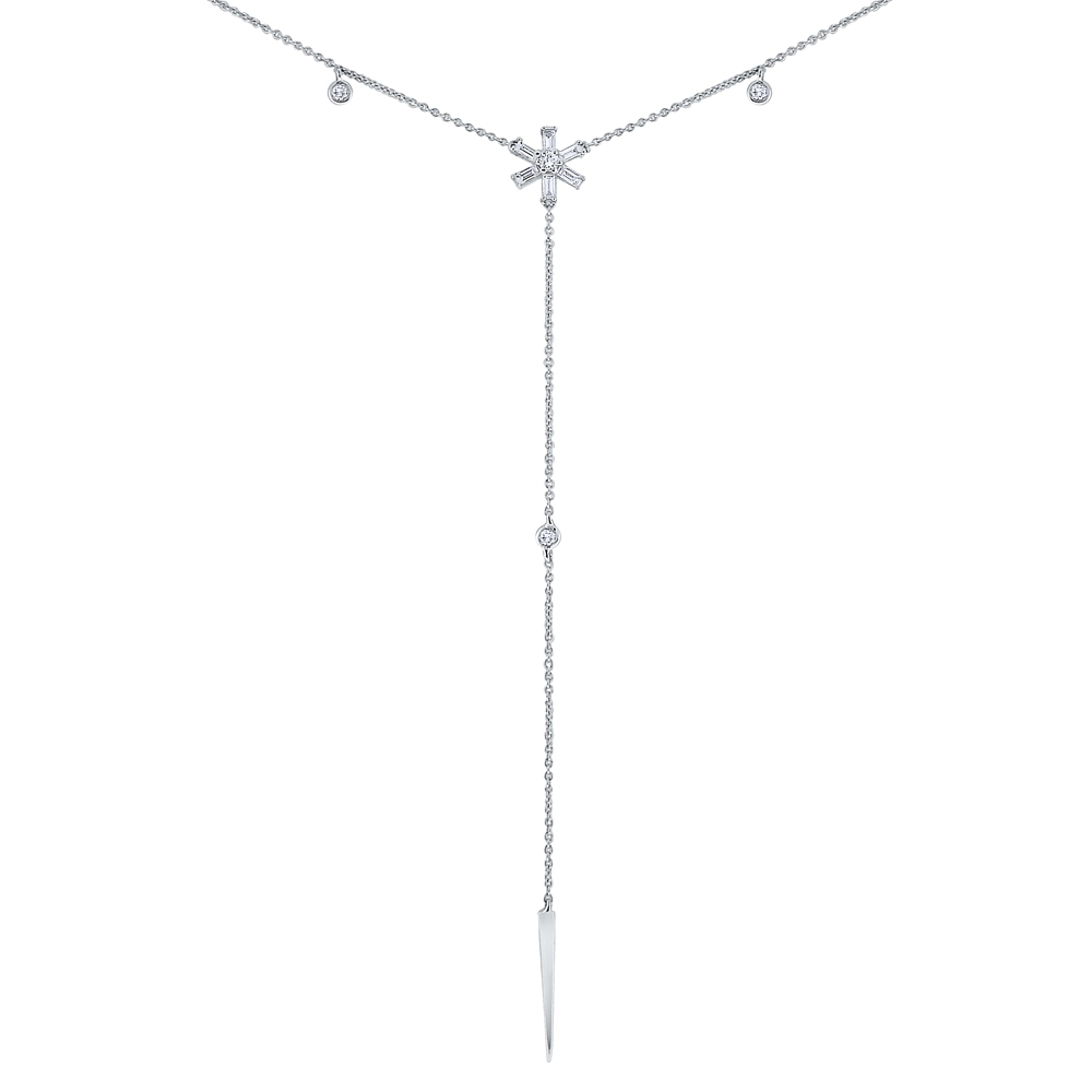 A floral design made up of baguette diamonds with a diamond accented chain make for a unique modern look, right on trend.