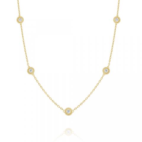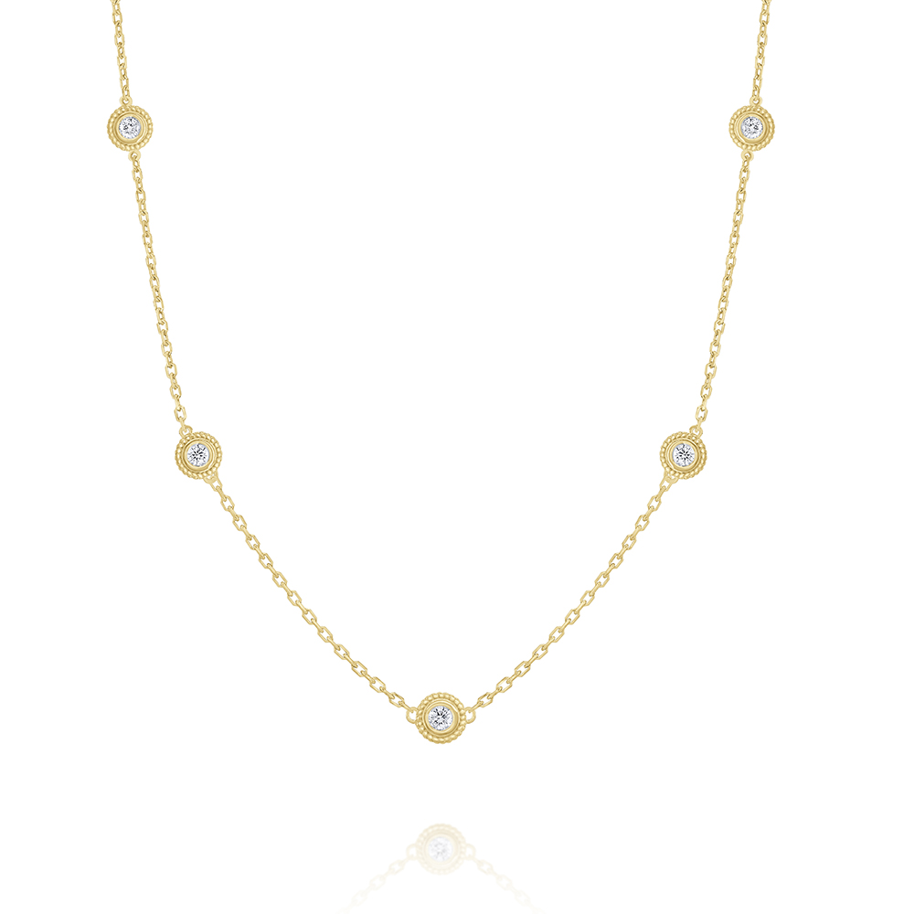 Diamonds set in detailed gold bezels are spaced evenly around an 18" chain. The perfect necklace for layering.