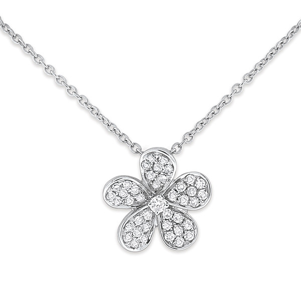 The sparkling flower that blooms on this diamond small floral necklace is sweet and feminine and it is certain to attract attention and compliments your way. A beautiful bloom that will never wilt or fade, it contains 46 twinkling .20 ct tw diamonds that shimmer and shine like dew drops on its petals. It is shown here in lovely white gold.