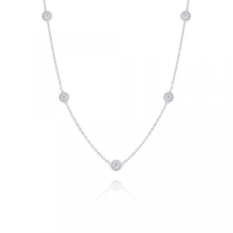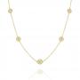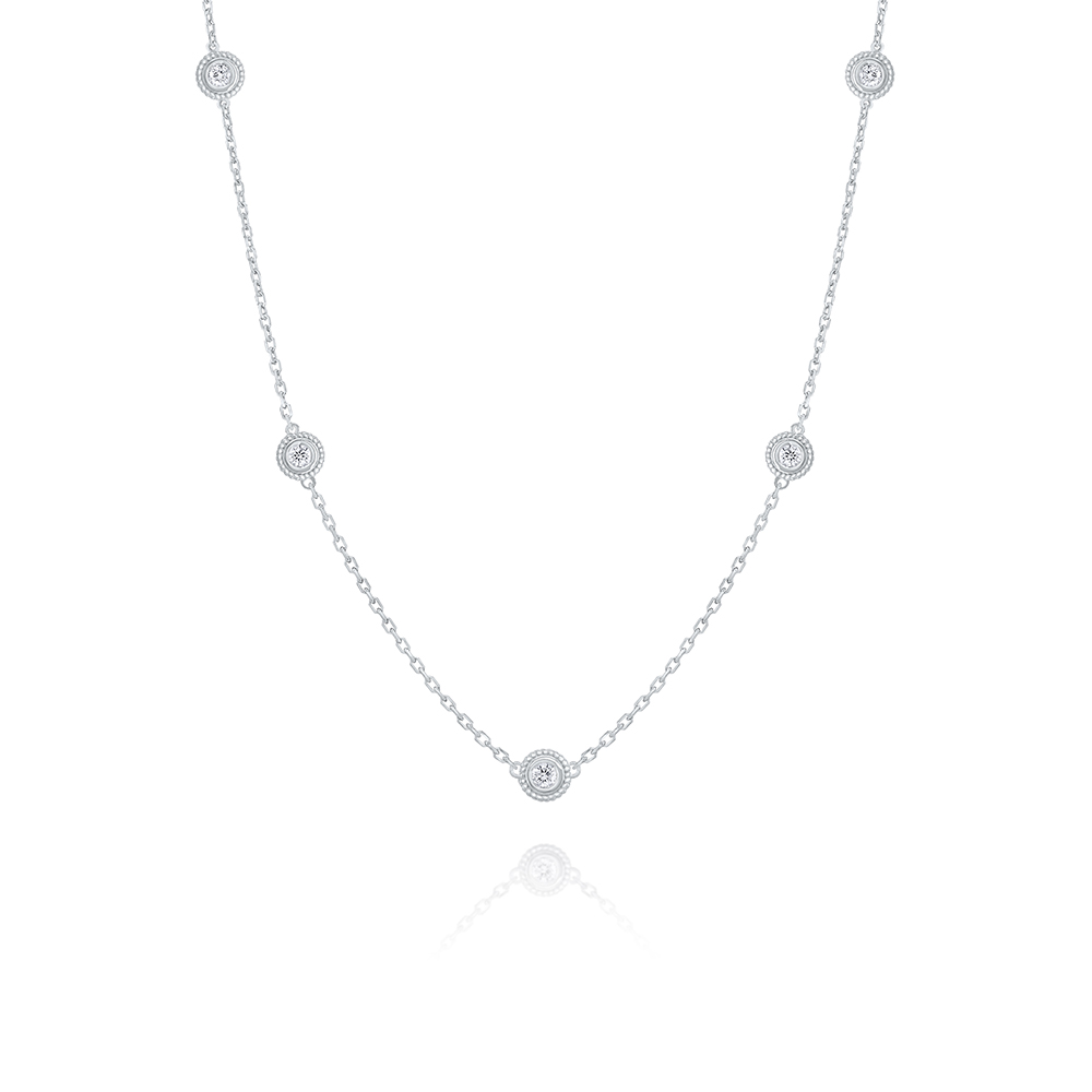 Diamonds set in detailed gold bezels are spaced evenly around an 18" chain. The perfect necklace for layering.
