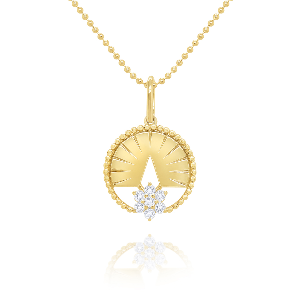 A floral cluster of diamonds sits below 14k golden rays resembling a setting sun on the horizon.