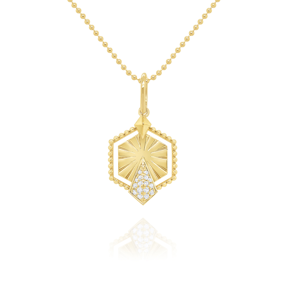 Diamond and 14k geometric shapes make up this modern design that hangs below a golden bead chain.