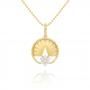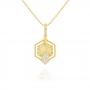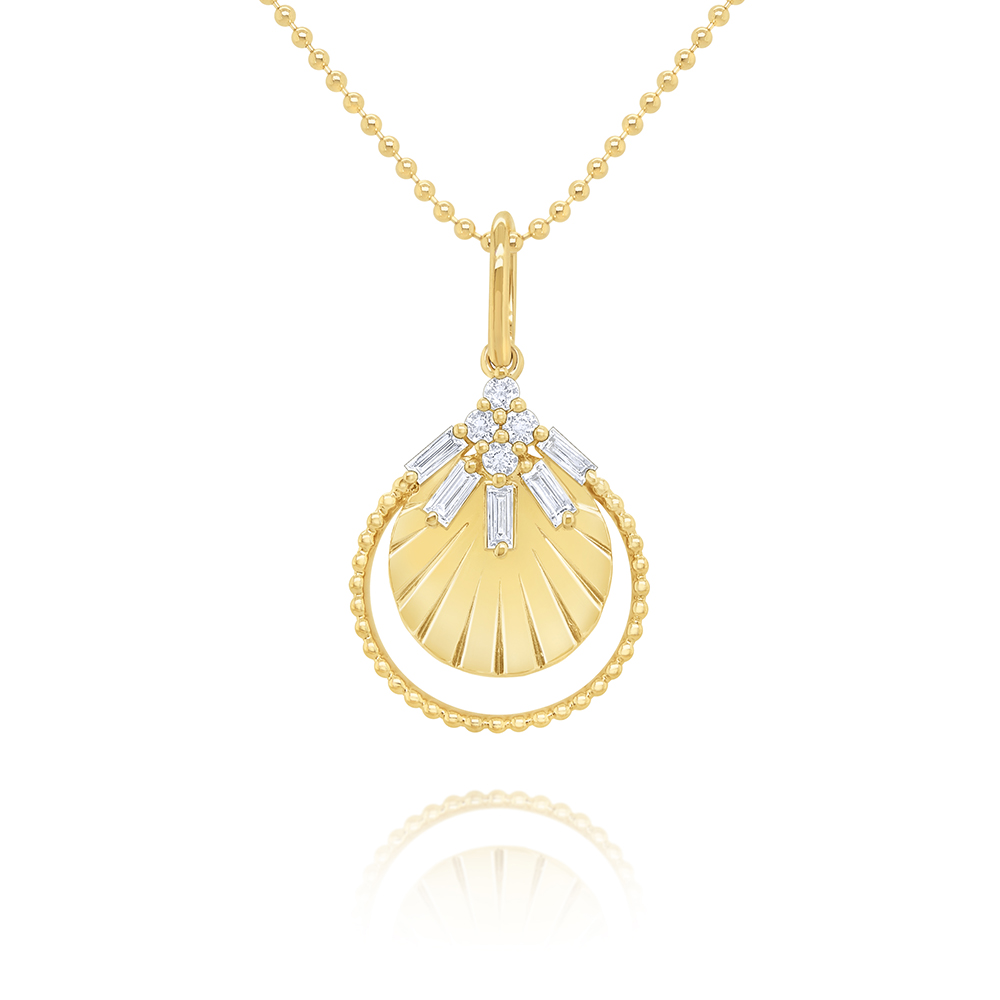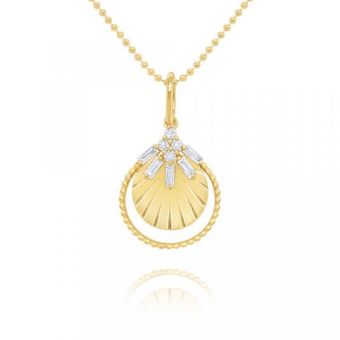 Round and baguette diamonds are set on a golden circle with a modern engraved sunray texture.