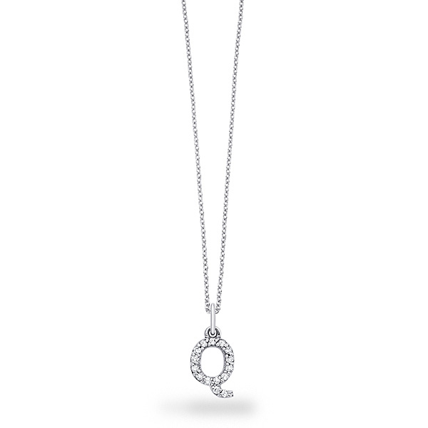 Diamond Baby Block Initial "Q" Necklace in 14k White Gold with 15 Diamonds weighing .13ct tw.