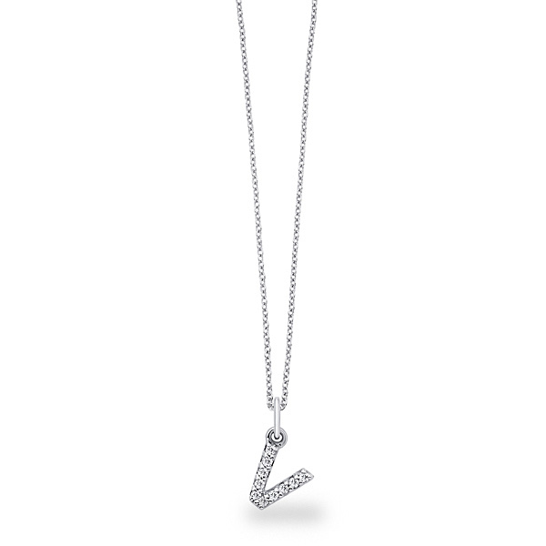 Diamond Baby Block Initial "V" Necklace in 14k White Gold with 10 Diamonds weighing .08ct tw.
