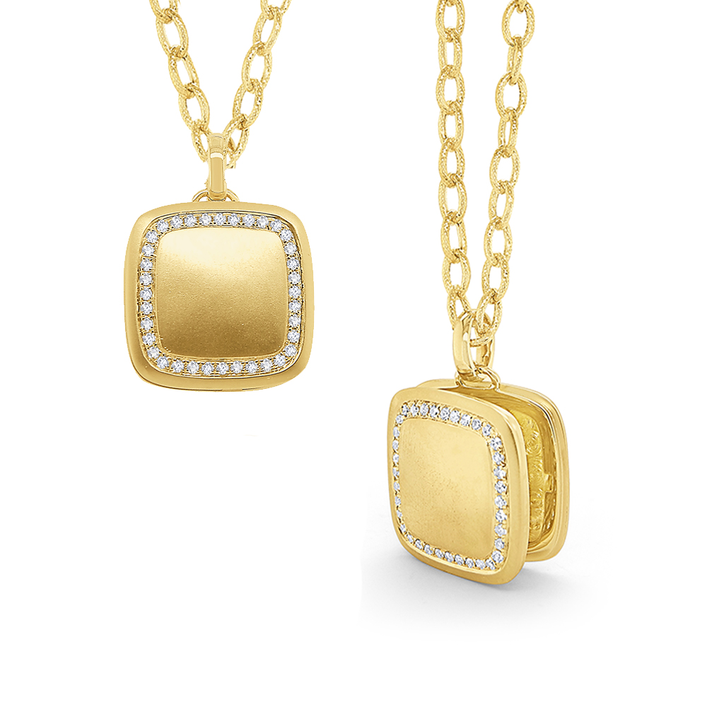 This 14k gold and diamond cushion shape locket is stunning with 36 sparkling diamonds framing it. The back is perfect for engraving and comes on a 18” open link chain.