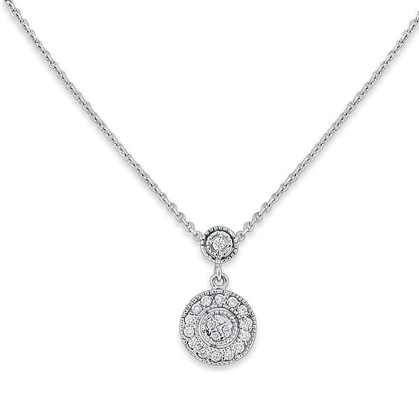 This diamond antique style necklace hearkens back to a long gone era of romance and sophistication, with an intricate design and gorgeous tiny details. You can evoke the glamor of the past with this stunning necklace, decorated with 19 exquisite .21 ct tw diamonds in a fascinating pattern and pictured here in lovely white gold.
